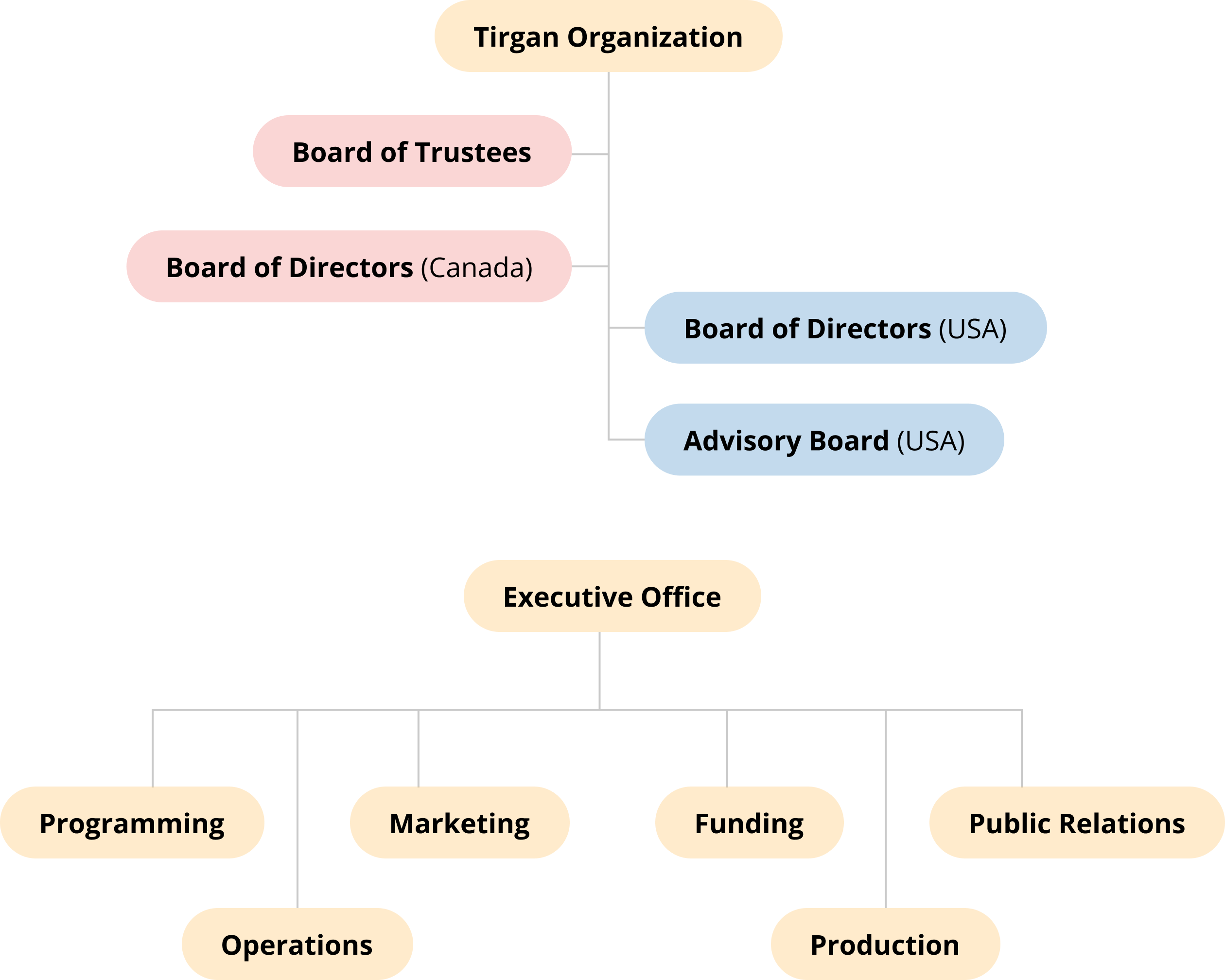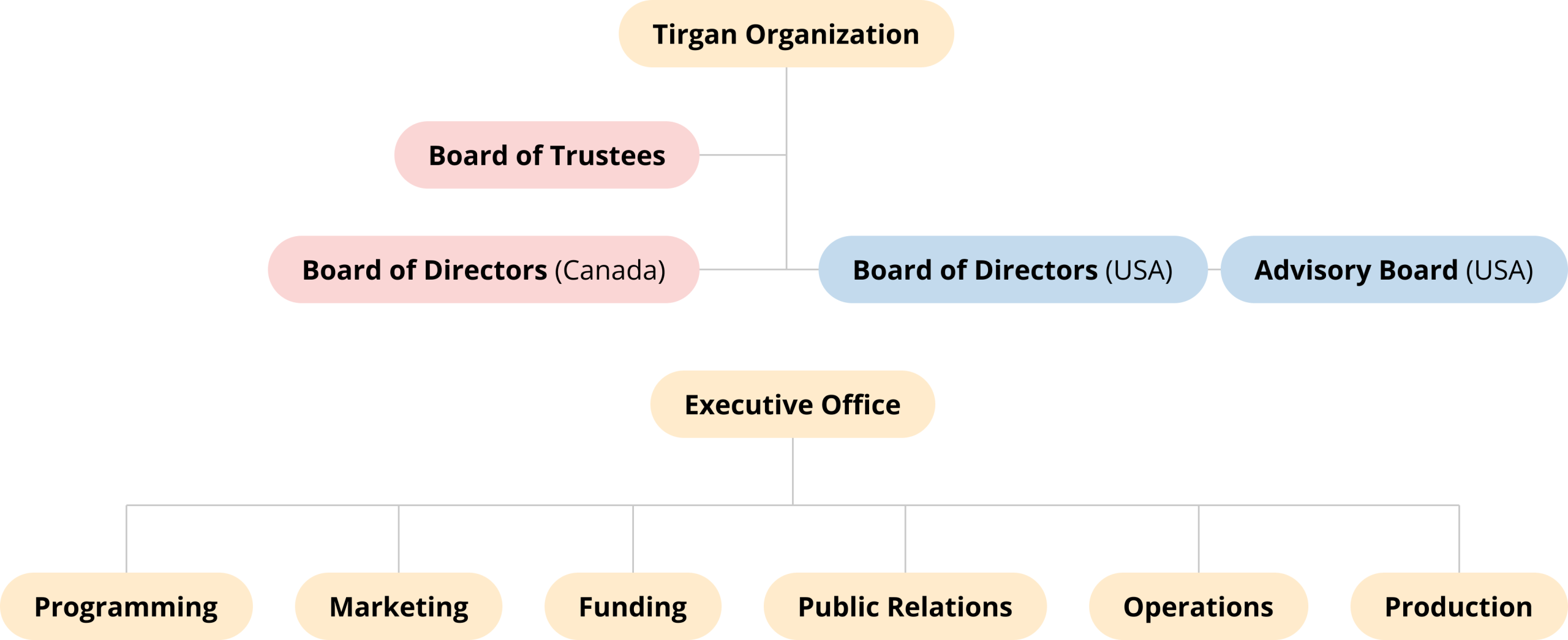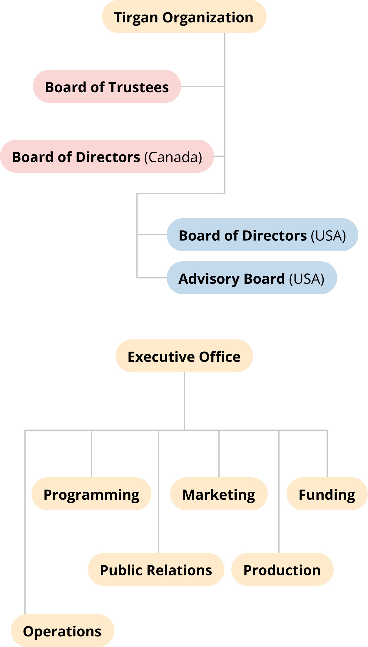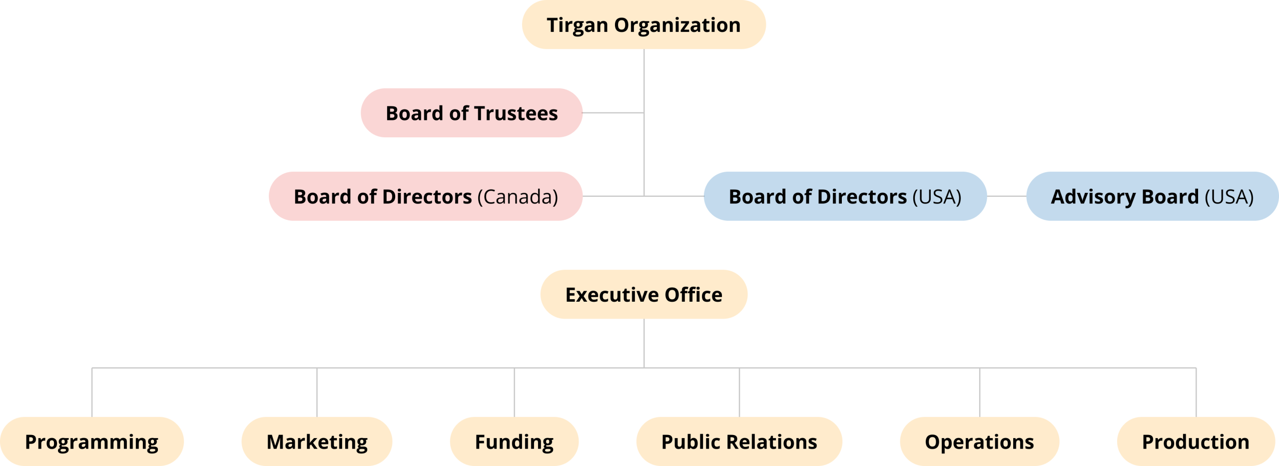 In the United States: Tirgan is registered as a 501(c)3 public charity and is lead by the Board of Directors in the United States, with additional guidance from Tirgan USA’s Advisory Board. These independent boards select an integrated executive team to carry out the projects and initiatives. Additionally, the executive Office oversees the organization’s core functional departments, including Programming, Marketing, Funding, Public Relations, Operations, and Production.